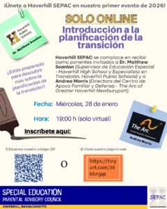 Haverhill SEPAC is thrilled to host guest speakers Dr. Matthew Scanlon (Haverhill Public Schools, Special Education Supervisor – Haverhill High School, and Transition Specialist) and Andrea Morris (Director of Family Support Center & Advocacy – The Arc of Greater Haverhill Newburyport).